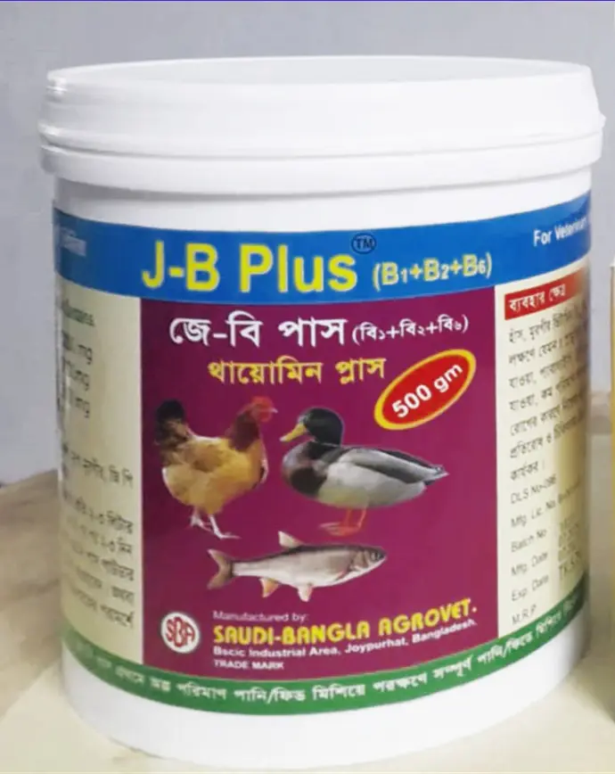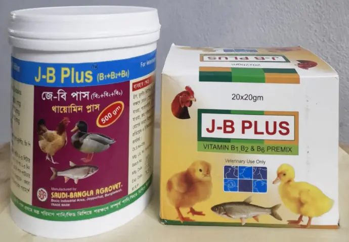 হাঁস মুরগির ভিটামিন বি১, বি২, বি৬ এর অভাব যেমনঃ ঘাড় বাঁকা হয়ে যাওয়া, প্যারালাইসিস, ঠোট ও পা বাঁকা হয়ে যাওয়া, কম পালক গজানো এবং অপুষ্টি ও সংক্রামক রোগের প্রতিরোধ ও সহায়ক চিকিৎসায় জে-বি প্লাস অত্যন্ত কার্যকর।